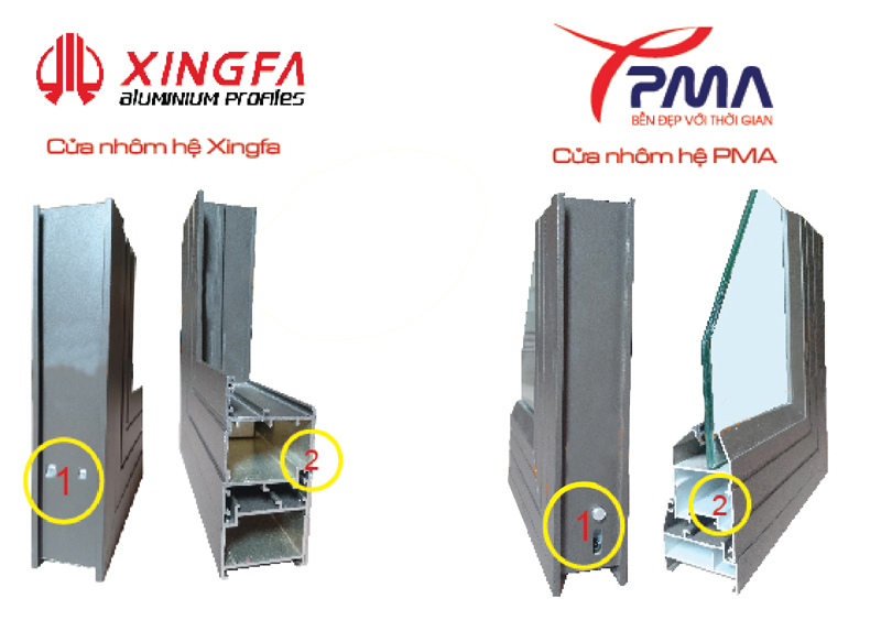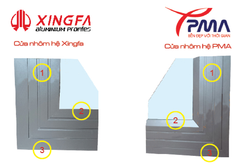 1. Mặt phải (mặt ngoài) của cửa nhôm hệ Xingfa và nhôm hệ PMA