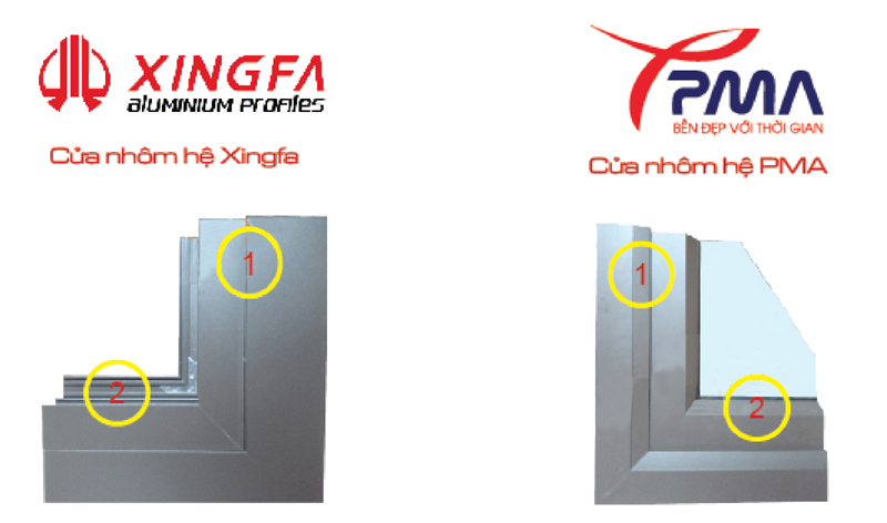 Nhìn mặt trong của cửa nhôm hệ Xingfa và cửa nhôm hệ PMA khá khác nhau.